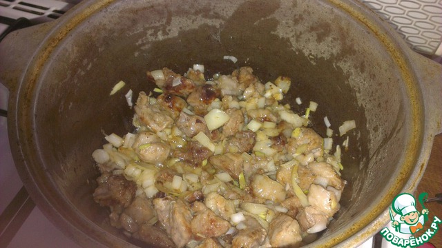 2) Когда мясо подрумянилось, солим и перчим. Добавляем к нему лук и тушим 2-3 минуты.