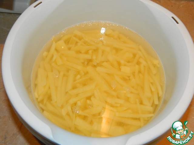 Очищенный картофель нарезать соломкой, залить холодной водой и оставить минут на 5-10.