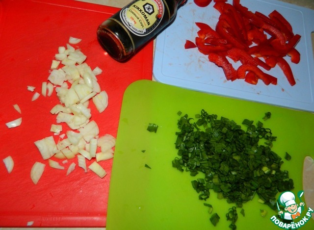 Нарезать лук, зелень и сладкий перец.
