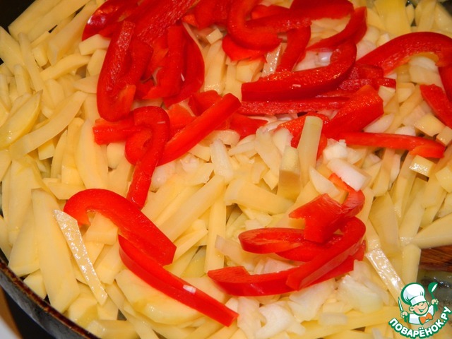 Слить воду с картофеля и выложить его на мясо. Добавить лук и перец. Перемешать. Обжарить всё до готовности картофеля.