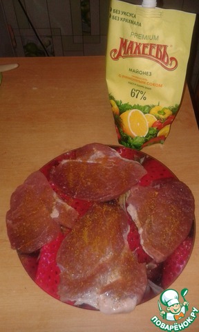 Хорошо отбиваем, солим, добавляем любимую приправу и смазываем майонезом "Махеевъ" (2 ст. л.)