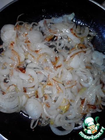Лучок режем полукольцами и обжариваем до золотистого цвета