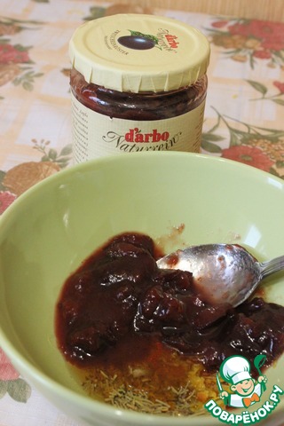 Делаю соус для запекания рульки. В глубокой тарелке смешиваю сливовый соус Darbo, мед, натертую цедру лимона, розмарин, красный перец.