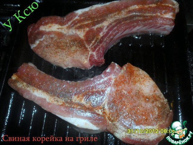 Через время достать, слегка обсушить на бумажном полотенце. Сковороду гриль раскалить на большом огне, смазать равномерно кисточкой маслом растительным (немного совсем), убавляем немного огонь (средний) и выкладываем корейку, обжариваем до готовности, периодически перевворачивая ее. Проверяем готовность - надавливанием на нее обратной стороной ложки, прокалывать не рекомендуется.