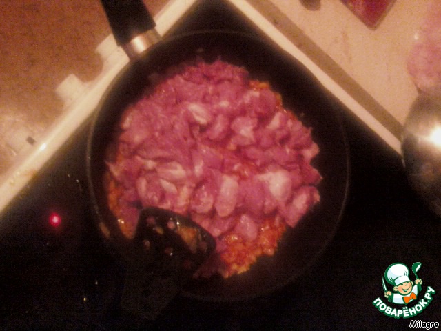 Режем мелко лук, кладем его в нагретую сковородку с маслом (по рецепту надо было сливочное, я не увидела и влила по привычке растительное, на вкусе не отразилось). В лук кладем наш кетчуп или томатную пасту, жарим, мешаем, через минут 5 добавляем туда мяско, тоже мелко нарезанное.