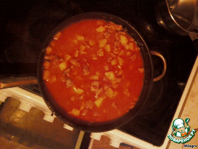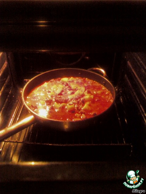 Тушим, пока картофель не станет мягким, тогда наливаем в сковородочку воду и ставим в духовку, нагретую до 200-220 градусов и держим, пока не выпарится вода.