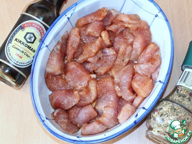 Все специи смешать или взять приправу для мяса. Добавить щепотку сахара, он усиливает вкус, 2 ст. л. соевого соуса и перемешать. Обвалять мясо в соусе, специях со всех сторон и положить в смазанную маслом посуду в которой будем запекать.