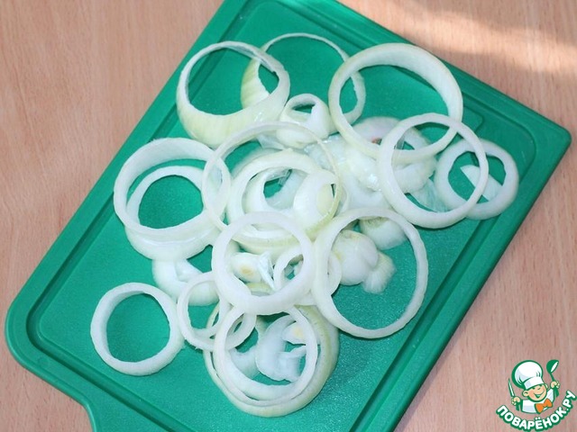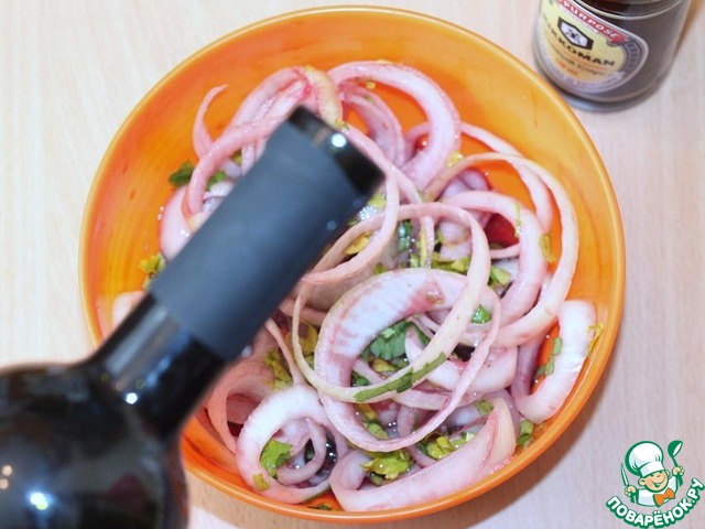 Выдавите в миску сок из лимона, добавьте вино и порезанный кольцами лук, перемешайте. Пусть лук промаринуется минут 10.