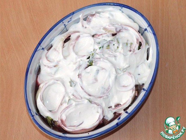 В сметану добавить 1/2 ч. л. сахара, немного соли и хорошо перемешать. Выложить сметану поверх в маринада.