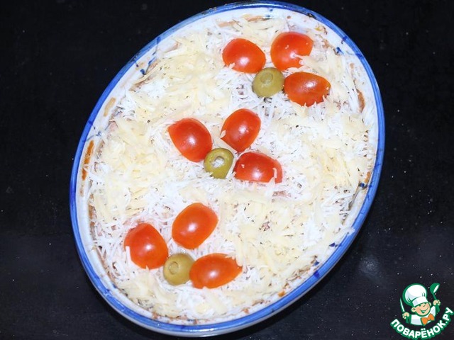За 5 минут до окончания запекания посыпать мясо тёртым сыром.