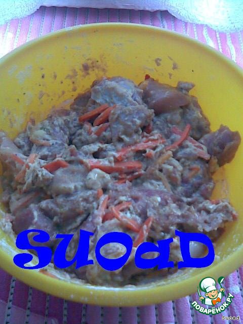 Кратко: Мясо вымочить, нарезать кусочками, смешать с чесноком, морковкой, соевым соусом, приправой, посолить, поперчить, оставляем на 30 мин.