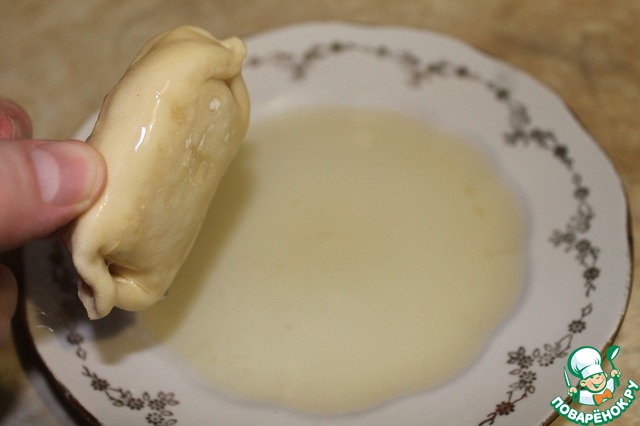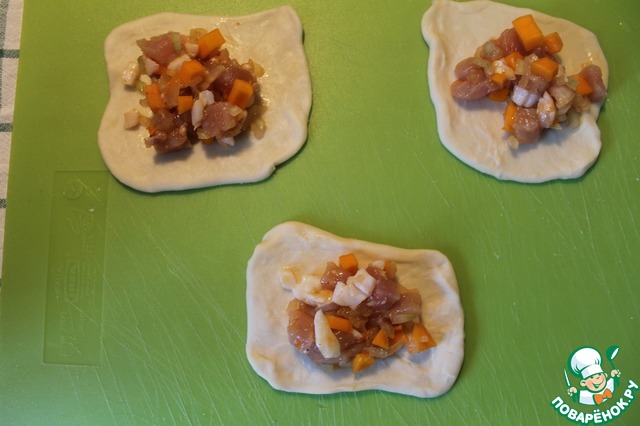 Скрепляем противоположные края квадратных лепёшек крест-накрест, плотно соединяя швы -- весь сок при приготовлении должен остаться внутри. А потом соединяем вместе противоположные края, чтобы получилась вот такая форма:
