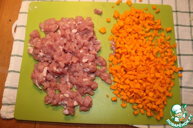 Свинину и тыкву также режем мелкими кубиками. Манты -- не пельмени, в качестве мясной начинки здесь не фарш, а именно мелко порубленное мясо.