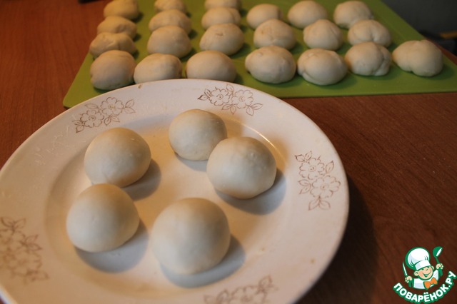 Разрезаем тесто на одинаковые части, по количеству мант, и формируем из них шарики, сантиметра 3 в диаметре.