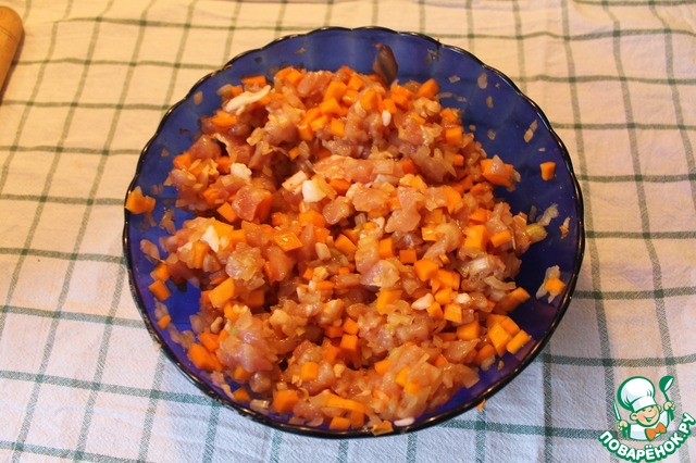 Начинку (лук, мясо, тыкву и специи) хорошенько перемешиваем.