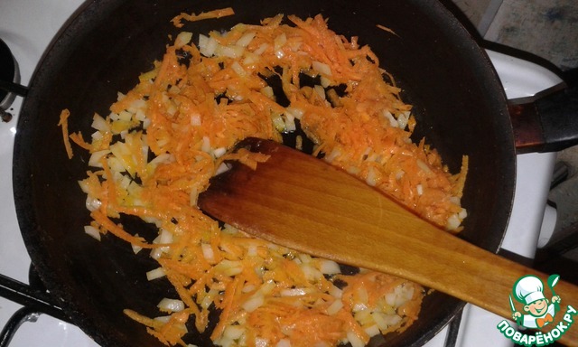 Морковь натереть на крупной терке, лук мелко порезать и обжарить на растительном масле