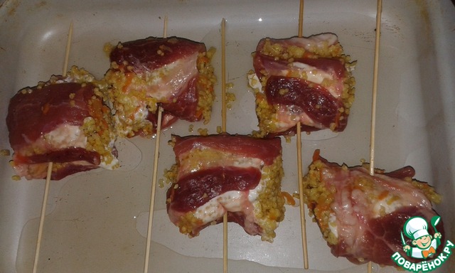 Свернуть рулетиком и сколоть зубочисткой (у меня они закончились, использовала шпажки). Выложить на смазанный маслом противень