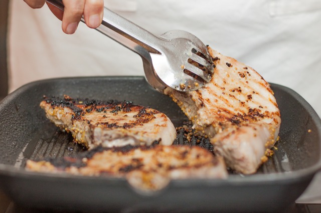 Раскалить сковороду-гриль, налить на нее немного растительного масла и обжарить отбивные с каждой стороны по 5 минут до румяной корочки. Переложить мясо в кастрюлю, посолить, накрыть крышкой и сохранять отбивные теплыми.