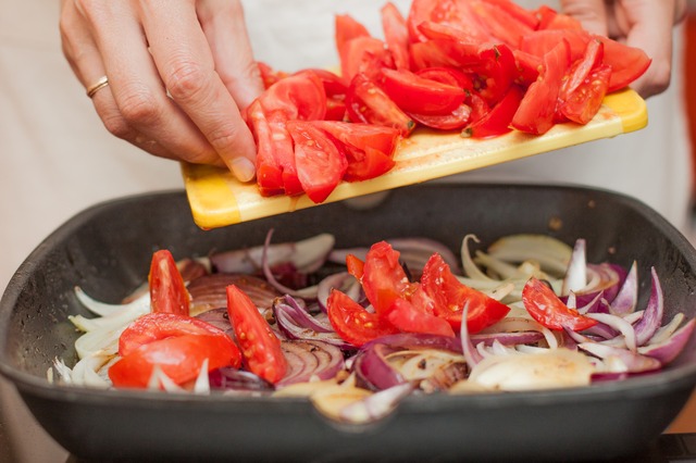 На сковороду, где жарились отбивные добавить растительного масла, положить лук и помидоры, посолить, поперчить, добавить лимонный сок, сахар и обжарить 5 минут.