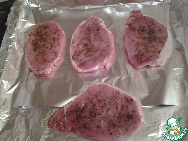 1. Мясо моем, натираем оливковым маслом и специями. Выкладываем на противень, застеленный фольгой.