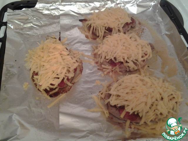 4. Мясо достаем и переворачиваем. На каждый кусочек выкладываем по столовой ложке огурцов с пастой. Посыпаем сверху тертым сыром.