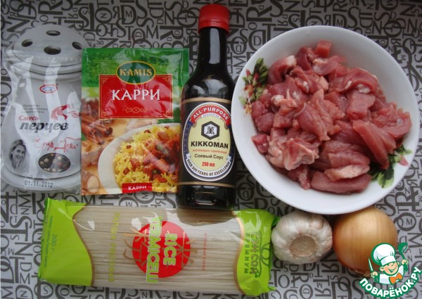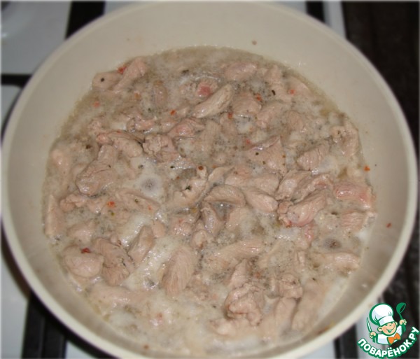 Свинину порезать брусочками и замариновать в соевом соусе мин. на 30.