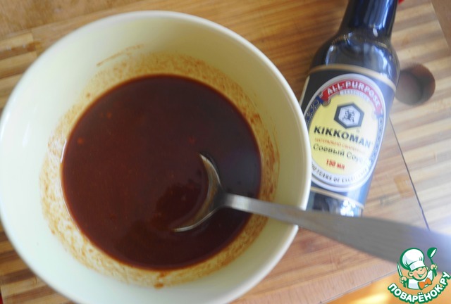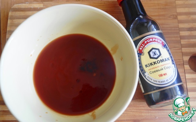 Приготовить маринад. Для этого кетчуп выложить в чашу, добавить соевый соус Kikkoman.