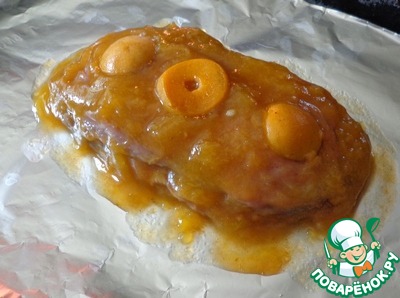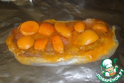 Кладем сверху одну половинку мяса и обильно смазываем ее сливовым соком, сверху кладем кусочки абрикоса.