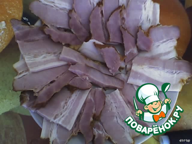 Грудинку нарезать толщиной 0,5см. (можно и тоньше).