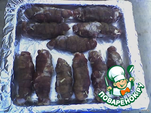 На противень положить фольгу и смазать ее подсолнечным маслом. Выкладываем рулетики. Ставим в духовку и запекаем до золотистой корочки на среднем огне.