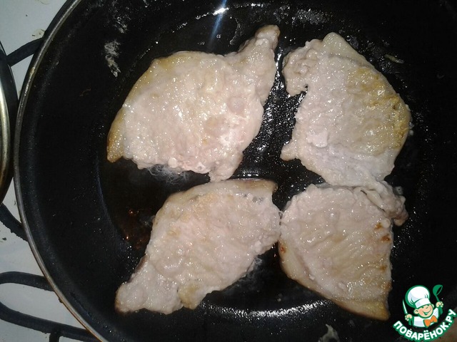 Отбивные приправить солью, перцем, обвалять в муке и обжарить на сковородке на растительном масле до золотистой корочки (примерно по 3 минуты с каждой стороны на сильном огне)