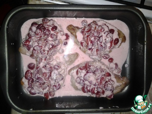 В форму для запекания укладываем отбивные и на каждую из них выкладываем крупный крыжовник из соуса, и затем все заливаем остатком этого соуса. Ставим в разогретую до 200 гр. духовку и запекаем примерно 30минут.