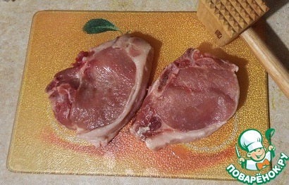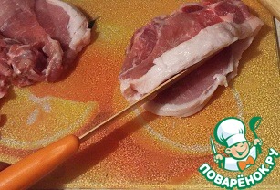 Свиная корейка нарезается не большими кусками и немного отбивается.