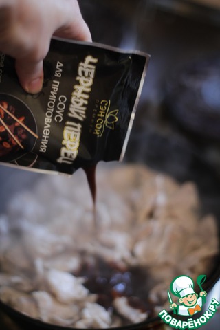 Затем добавить соус для приготовления мяса "Черный Перец" и довести до готовности в течение 1 минуты,