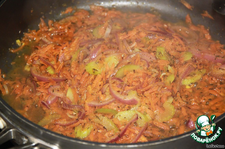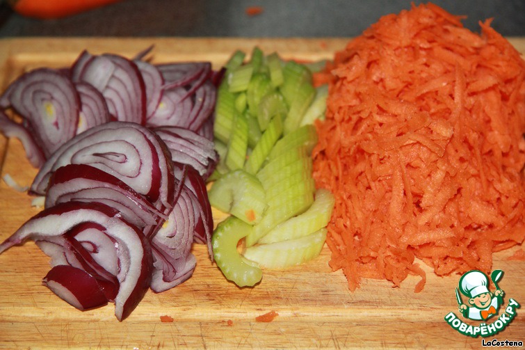 Подготовим овощную заправку: морковь потрем, лук порежем полукольцами, сельдерей - дольками.