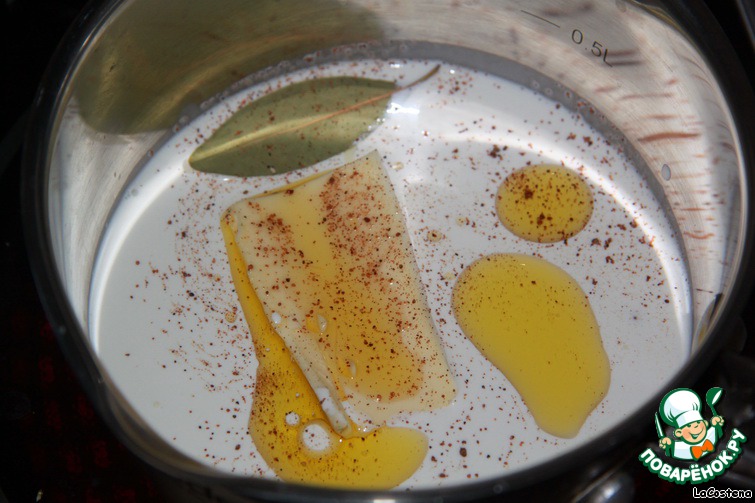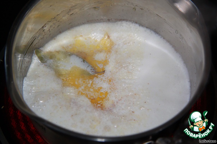 В сотейнике соединим молоко, сливки, сливочное и оливковое масло, мускатный орех и лавровый лист.