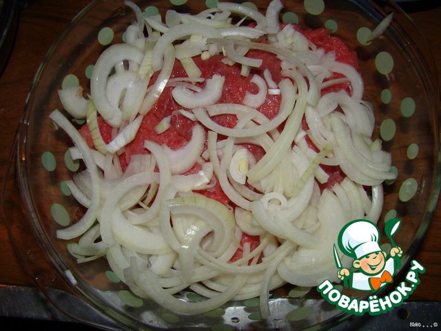 Посередине выкладываем замаринованное мяско и поливаем оставшимся маринадом… лук, кстати, также выкладываем на мяско.