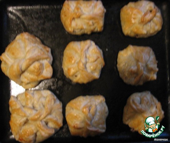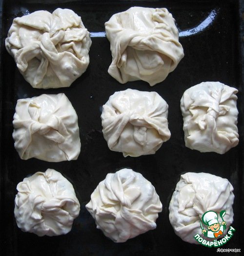 На каждый квадрат выложить начинку, завязать за уголки в виде мешка и выложить на смазанный маслом противень.