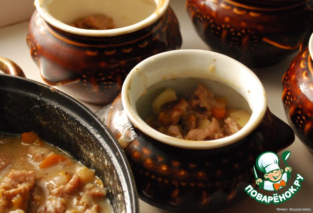 На дно горшочка кладем порезанный картофель, сверху выкладываем мясо вместе с подливкой.