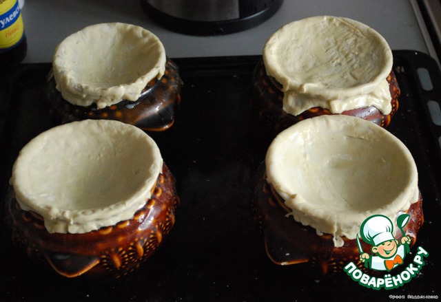 Раскатываем слоеное тесто, вырезаем круги (я по крышкам от горшочков вырезала), накрываем тестом каждый горшок. В центре делаем надрез для выхода пара, смазываем яйцом. Запекаем в духовке 25-30 минут при температуре 180-200 гр. до румяного теста.