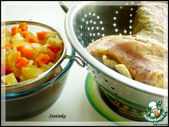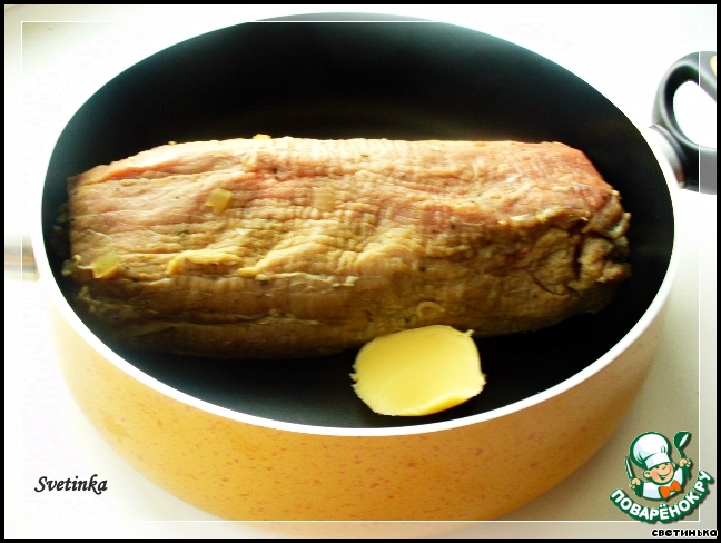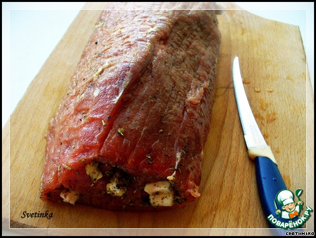 На ветчину положила наш замечательный нашпигованный кусманчик мяса.