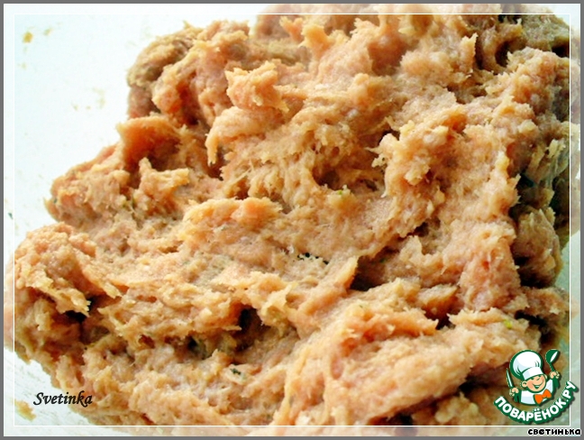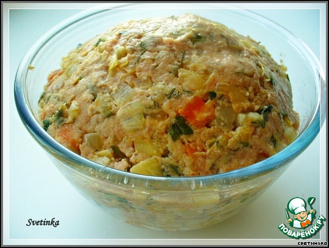 Сейчас добавляем сосисочный фарш и яйцо в остуженные овощи и хорошенько перемешиваем. Масса должна быть очень липкой!
