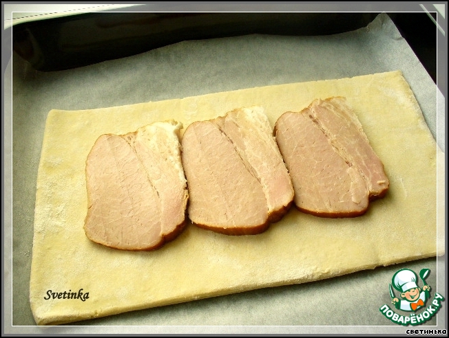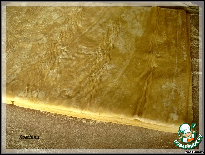 Переходим к самому интересному. У меня было 2 пакета готового слоеного теста по 500 г. Листы теста длинные и узкие. Исходя из соображений, что начинки много и вес ее зашкаливает, нижний слой я сделала следующим образом. Сложила пласт пополам и немного раскатала его по длине, чуть превышающей размеры куска мяса.