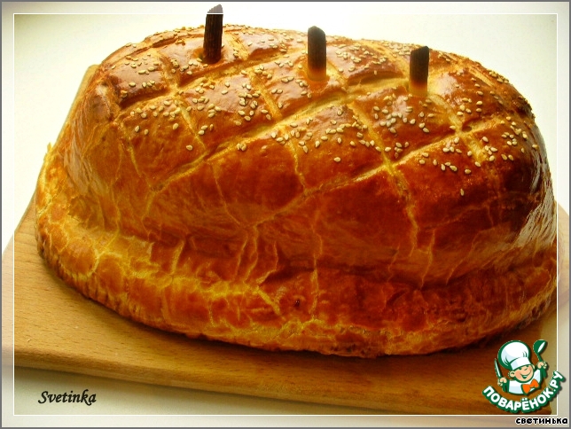 Наносим ножом узор, НЕ прорезая тесто насквозь. Вставляем макаронины для выхода пара. Обмазываем тесто яйцом и посыпаем кунжутом. Отправляем наше грандиозное сооружение в разогретую до 210 градусов духовку на 30 минут (до зарумянивания теста).