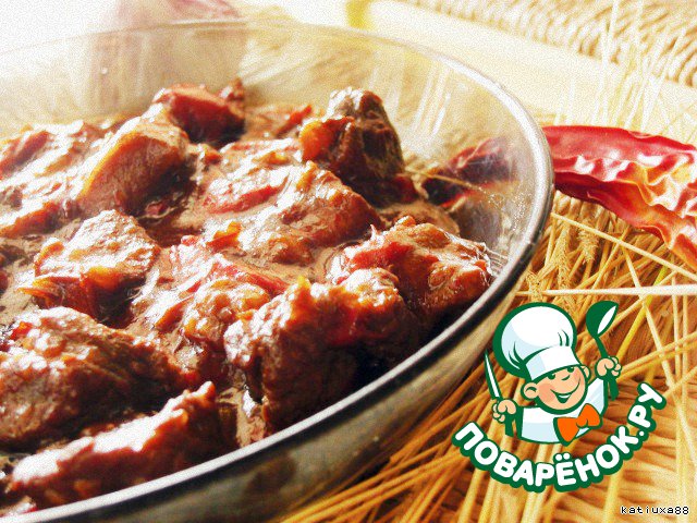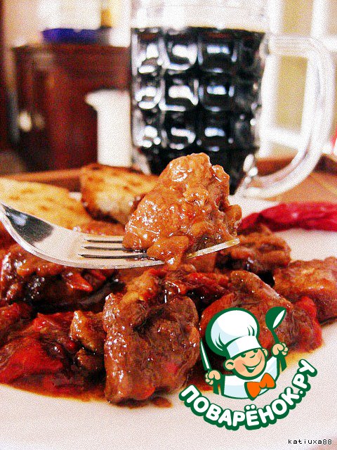 | Рецепт этого блюда был размещeн на сайте в 2008 году пользователем gnomik под названием "Говядина по-чешски" и иллюстрирован мной в рамках акции "Раскраски". Получается очень вкусное и мягкое мясо с нежной подливой. |