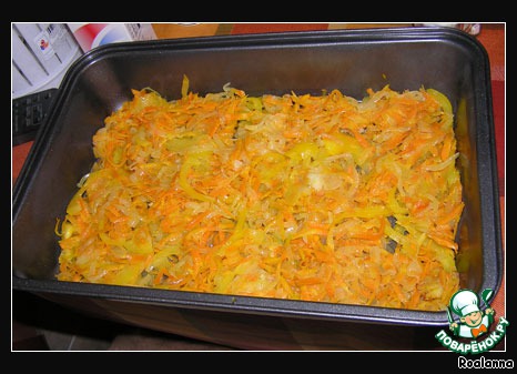 Готовим подушку для мяса. Лук порезать полукольцами, посолить, обжарить до золотистого цвета на растительном масле, морковь натереть на крупной терке, добавить к луку, потушить 5 минут. Сладкий перец порезать, добавить к моркови с луком, погреть еще минутку.