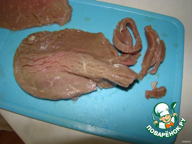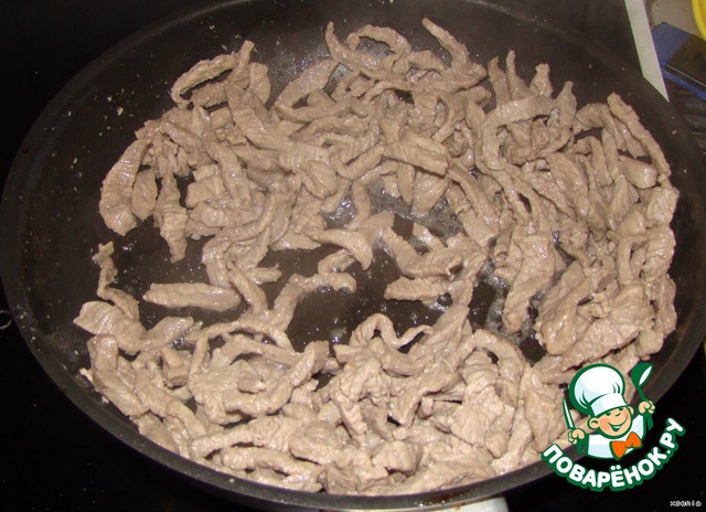Мясо режем на маленькие тонкие кусочки. Можно сказать соломкой