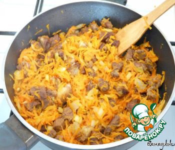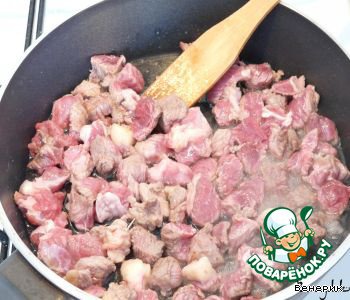 Нарезаем мясо кубиками, обжариваем на растительном масле и тушим.