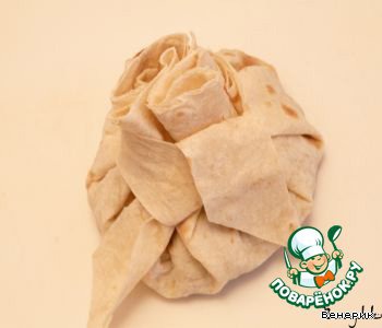 Заворачиваем, завязываем. Один лаваш нужно будет нарезать на полосы, для завязывания.