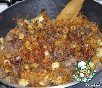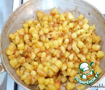 Картофель, нарезанный кубиками, жарим отдельно, не забывая посолить и поперчить, и добавляем к мясу.